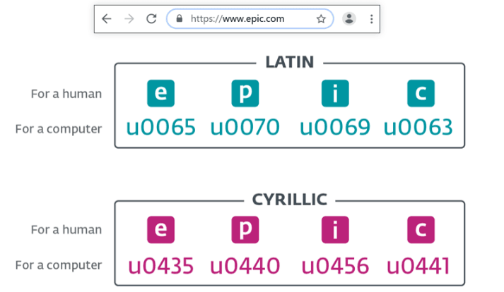 - Ataques em e-mails de phishing: Um e-mail aparentemente enviado pela sua instituição bancária pode ter um link como банк.com (em vez de bank.com). O “б” é uma letra cirílica que parece com “b”, mas direciona para um site falso.