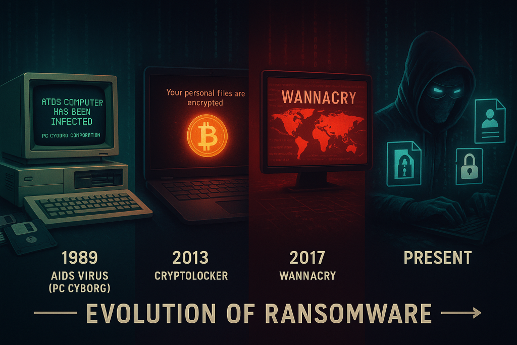 O primeiro registro de ransomware data de 1989, com o Vírus AIDS (PC Cyborg). Criado por Joseph Popp, ele se espalhava via disquetes, criptografava nomes de arquivos e exigia um pagamento de US$ 189 para liberar o acesso. Apesar de rudimentar, estabeleceu o modelo de extorsão que vemos hoje. [1]